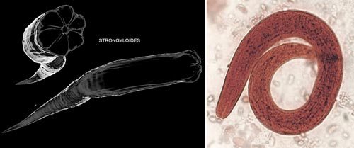 Strongyloides là giun ký sinh ở người gây ra các bệnh về đường ruột. Ở giai đoạn ấu trùng chúng có hình dạnh như sợi chỉ, tồn tại độc lập trong đất mà không cần vật chủ. Vòng đời của nó bắt đầu khi ấu trùng tiếp xúc với vật chủ khi vật chủ tiếp xúc với đất có nhiễm phân, ấu trùng khi đó sẽ xâm nhập qua da, di chuyển đến các động mạch ở phổi, từ đó chúng tiếp tục di chuyển đến cơ quan hô hấp của vật chủ đợi cho đến khi được nuốt vào ruột.