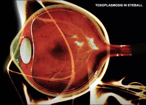 Khi nhiễm vào cơ thể người, ký sinh trùng toxoplasma tạo thành những u nang ở mô, thường là cơ xương, ở não và mắt. Mặc dù nhiều người bị nhiễm loại ký sinh này nhưng lại không biểu hiện triệu chứng gì vì hệ miễn dịch của họ kiểm soát được loại ký sinh này. Khi cơ thể bị ốm, hệ miễn dịch yếu đi, lúc này sẽ có một số biểu hiện giống bệnh cảm cúm. Chúng kéo dài khoảng vài tuần rồi biến mất. Tuy nhiên, ký sinh trùng vẫn ngủ trong cơ thể và sẽ hoạt động trở lại khi hệ miễn dịch bị yếu gây ra một số bệnh mắt cấp tính như viêm võng mạc màng mạch và có thể dẫn đến mất thị lực.